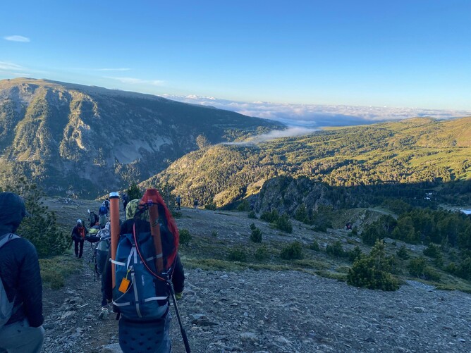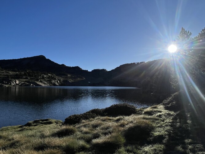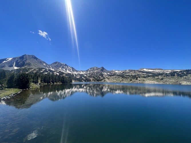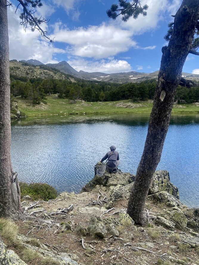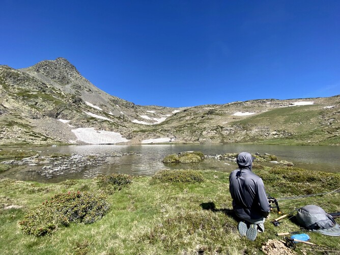 The third beat was on the main lake opposite the Camporells refuge and seemed to have two areas where the fish were more active near the bank which I decided to target. The first was between a weed bed and the bank along a 50-meter stretch with good numbers of fish visible, and the second near a big rock where I could spot fish cruising. I started near the weed and missed a dry fly eat on the beetle near the bank. The missed dry fly eats were a common story for a lot of competitors I talked to later, probably due to the speed and often nervousness the fish took with. I had a lot of fish reject the dry after very closely inspecting it which didn’t seem to improve with any of the many of the fly changes I made even on the super thin (0.08) tippet with mud. After 20 minutes I changed to a size 18 PT with a black 1.5mm bead to try sight nymphing in the glassy conditions. This proved to be a good change bringing me two fish in the next 15 minutes, although the speed at which the fish ate meant I missed a few too. At least they were more confident with the nymph.