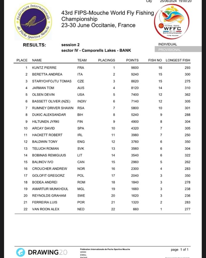 I caught several undersized fish and missed a take on the dry from the stream mouth, as well as catching one measurer close to the stream on a small black F fly and another much further out from there that also measured. Andrea caught 4 of the fish on his side of the marker on some sort of dry wet combo quickly however and Tom caught a couple as well. With 25 minutes left I headed around the other side and got takes from two fish near the bank sight nymphing, neither of which stuck as I didn’t quite get the timing right. The fish were very hard to hook on the nymph in the shallows (as they were so quick) and it was hard to be fast and not snap off. I tried a few long casts again from the stream mouth without success with left me with a total of 12 fish for the session for 6th place behind FRA (16), ITA (15), CZE (15), AUS (14) and USA (12 but bigger fish).